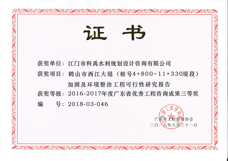 鶴山市西江大堤加固及環(huán)境整治工程可行性研究報告榮獲省三等獎
