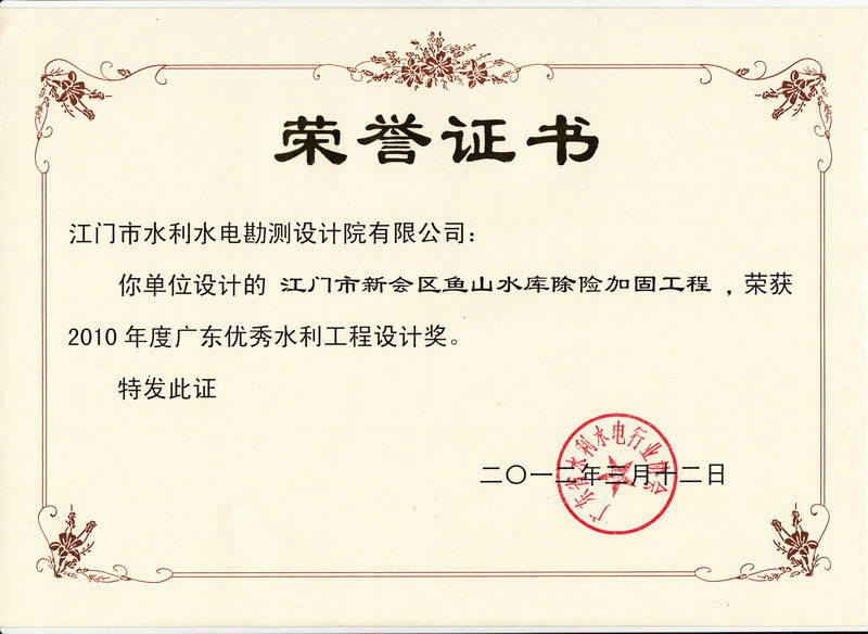 魚山水庫(kù)2010年度廣東優(yōu)秀水利工程設(shè)計(jì)獎(jiǎng)