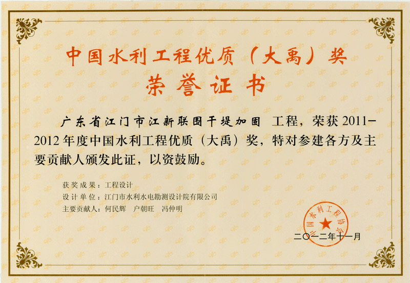 江新聯(lián)圍榮獲2011-2012年度中國(guó)水利工優(yōu)質(zhì)(大禹)獎(jiǎng)