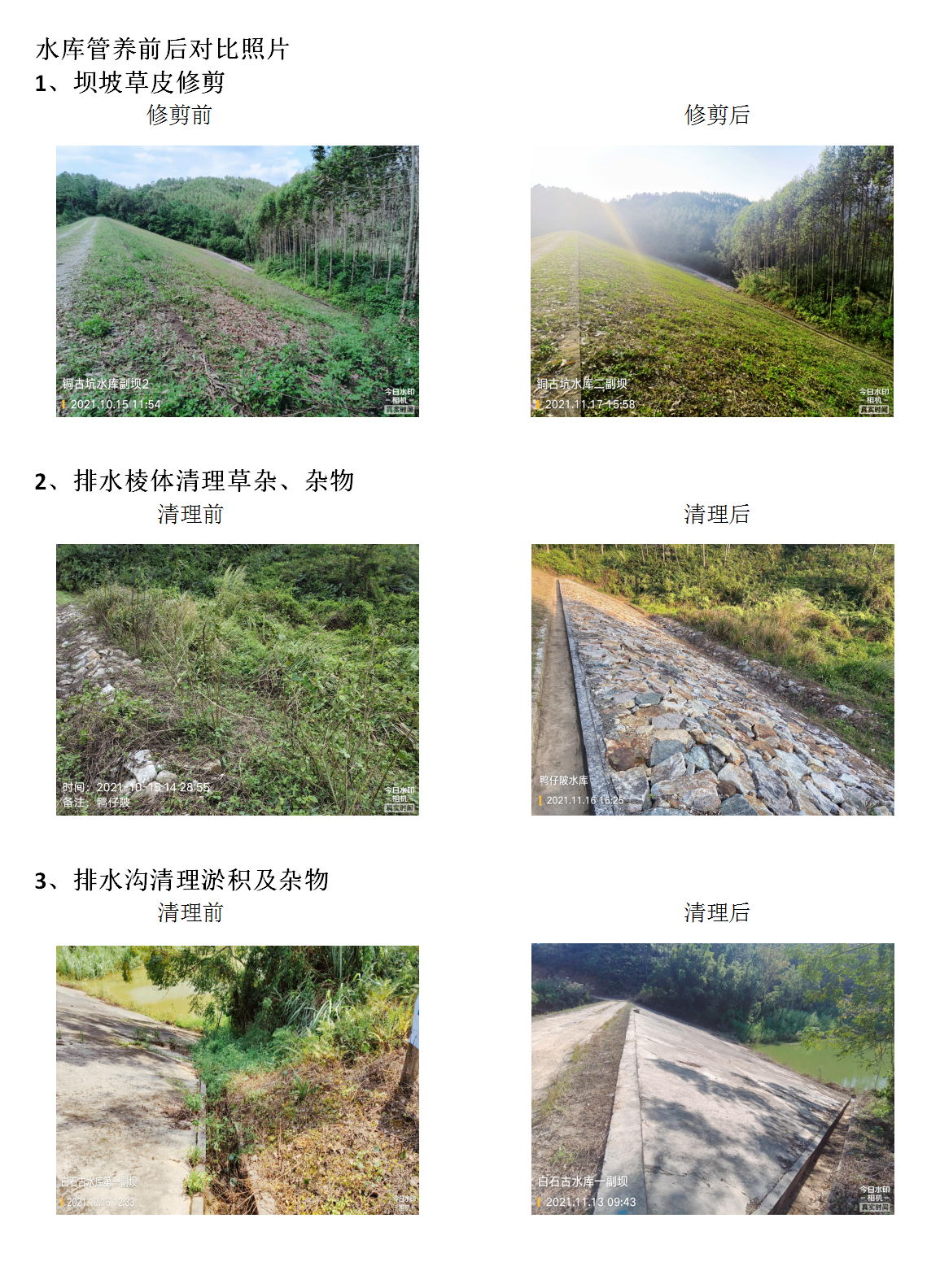 我公司作為項(xiàng)目承接服務(wù)單位,自收到中標(biāo)通知書后立即組織專業(yè)的巡查隊(duì)伍對(duì)本項(xiàng)目所涉10個(gè)鎮(zhèn)(街)72宗水庫進(jìn)行全面的巡查摸底工作,形成了一整套基礎(chǔ)成果資料。截止目前,已完成第一輪的維修養(yǎng)護(hù)任務(wù),各水庫的壩容壩貌已有明顯改善。下一步,維修養(yǎng)護(hù)工作重點(diǎn)將投入到維修養(yǎng)護(hù)水庫細(xì)節(jié)之處,通過“大而全”、“精而細(xì)”專業(yè)化、細(xì)致化的管護(hù)工作,全面提升水庫壩容壩貌,使小型水庫管養(yǎng)呈現(xiàn)煥然一新局面。