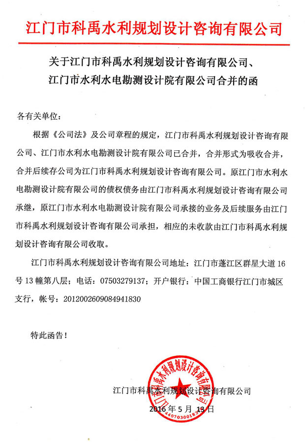 關(guān)于江門市科禹水利規(guī)劃設(shè)計咨詢有限公司、江門市水利水電勘測設(shè)計院有限公司合并的函