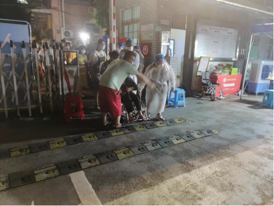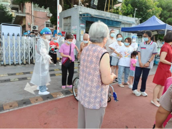 ▲志愿者幫助行動(dòng)不便的老人推輪椅做核酸