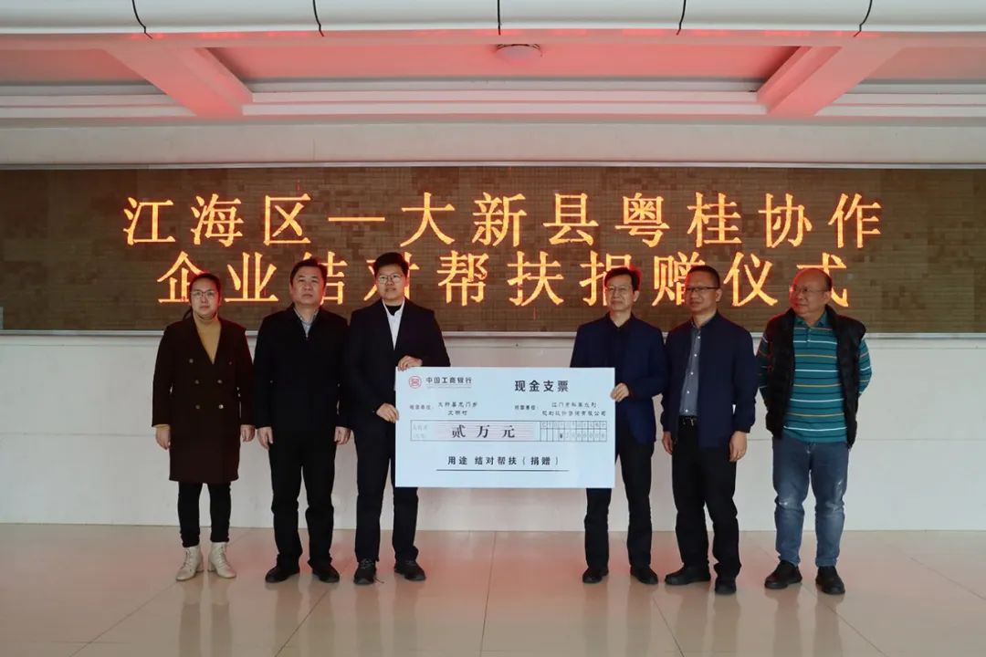 2023年2月7日至9日,我公司赴廣西大新縣開展結(jié)對幫扶活動。在廣西大新縣,我公司參加了在該縣縣委一樓召開的“2023年江海區(qū)-大新縣粵桂協(xié)作對接會議”,會后,我公司與大新縣鄉(xiāng)鎮(zhèn)代表舉行了結(jié)對幫扶捐贈儀式。