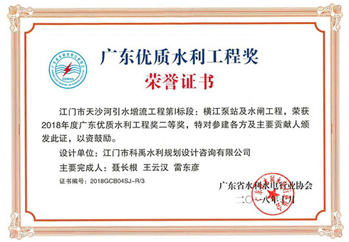 江門市天沙河引水增流工程第I標(biāo)段榮獲省優(yōu)質(zhì)水利工程獎二等獎
