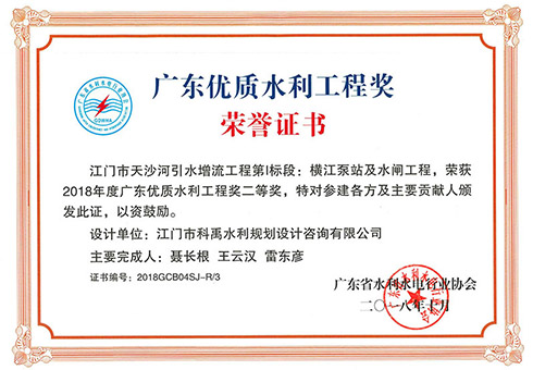 橫江泵站及水閘工程榮獲2018年度廣東優(yōu)質(zhì)水利工程二等獎