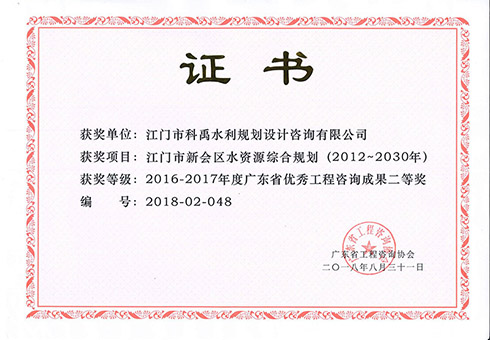 江門市新會區(qū)水資源綜合規(guī)劃(2012~2030年)榮獲省二等獎