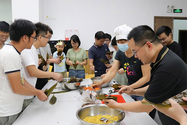 隨后,別開生面的包粽子活動(dòng)開始。在繁忙工作之余,大家圍坐在一起動(dòng)手包粽子。食堂廚師現(xiàn)場(chǎng)教學(xué),向員工傳授包粽子經(jīng)驗(yàn)。粽葉在員工手中飛舞,裝米、裹葉子、填餡料、綁?mèng)站€,有包粽子經(jīng)驗(yàn)的員工麻利迅速,很快就包好一個(gè)粽子,有些現(xiàn)學(xué)現(xiàn)賣的員工則狀況不斷,經(jīng)常出現(xiàn)露餡、弄破粽葉等情況,給活動(dòng)增添不少樂趣。各式各樣的粽子陸續(xù)誕生,各具特色。大家互學(xué)互幫,一起享受著包粽子的過程,感受大家庭的氛圍。