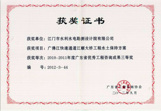 《廣佛江快速通道江順大橋工程水土保持方案》獲得“2010-2011年度廣東省優(yōu)秀工程咨詢成果三等獎(jiǎng)”