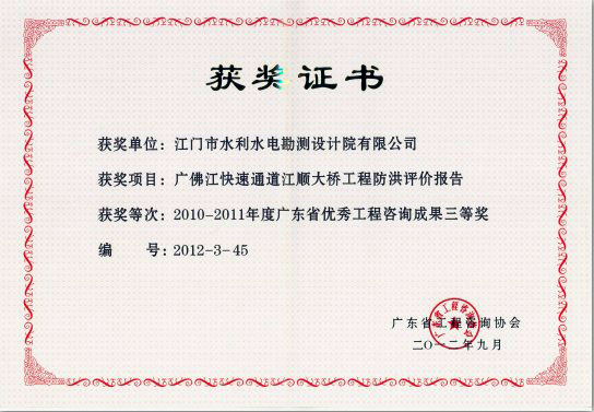 《廣佛江快速通道江順大橋工程防洪評價報告》獲得“2010-2011年度廣東省優(yōu)秀工程咨詢成果三等獎”