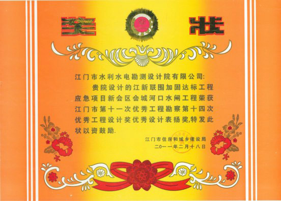 《江新聯(lián)圍加固達標工程應急項目新會區(qū)會成河口水閘工程》獲得“江門市第十一次優(yōu)秀工程勘察第十四次優(yōu)秀工程設計獎